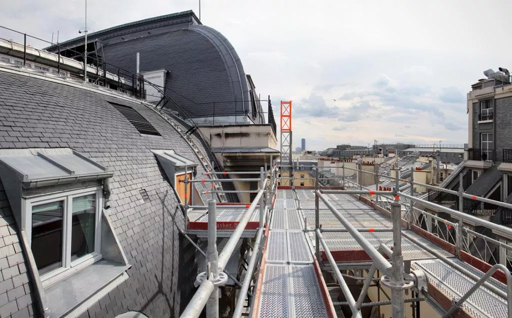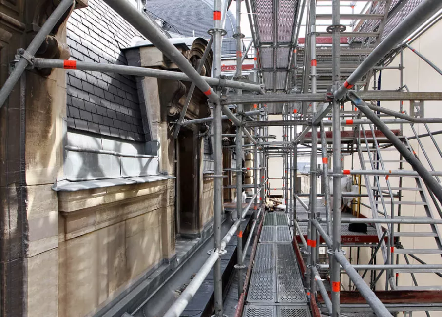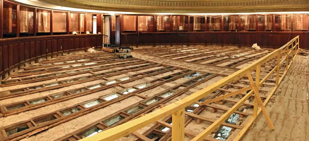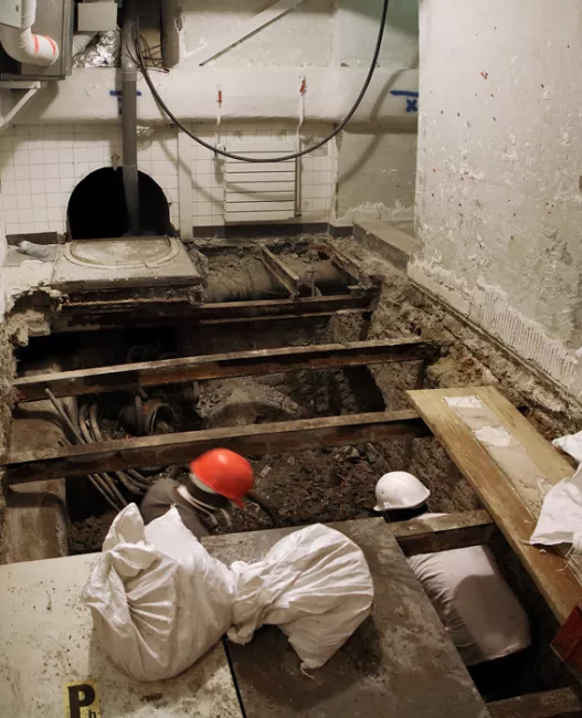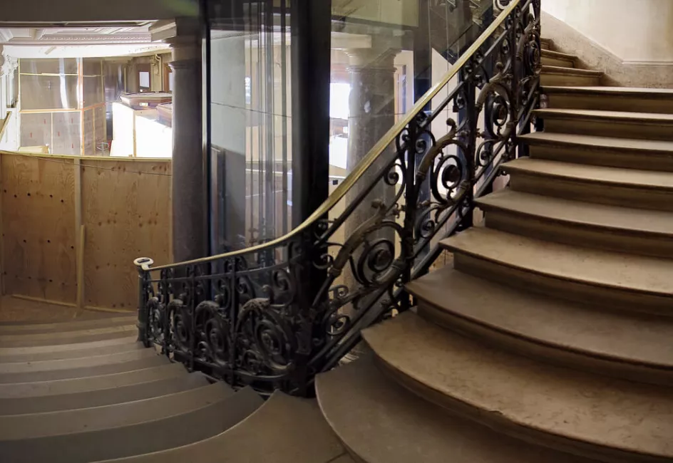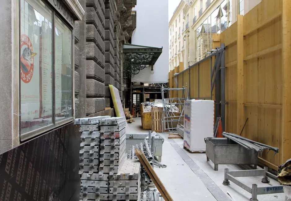 Today the orchestra section is bare. The floor is stripped of its wood flooring, the iron structures that could not be used on the Eiffel Tower are protected with ordinary wooden casings, concrete blocks hold the huge scaffolding that will soon occupy the theater from top to bottom and the hangings have been removed – appearing to be torn down from afar – adding to the desolation. To those who used to come to Favart, the first two photos are somewhat shocking. They express the extent of what is taking place on the construction site. On reopening our house, the audience will be pleased to feel coolness from under their seats. Two hundred small, invisible and silent vents will renew the auditorium air. Those familiar with the Salle Bizet and the elevator that leads to the upper floors will probably take a look at photo n°6 and try to disregard the boxing that protects the marbles and gildings. Number one rule on this gigantic construction site in such a historic place: first protect what has great value and is to stay on site before starting the actual work. The impression of preparation is most obvious inside and outside the building. Then, the desolation tends to recede. The appearances are misleading. Things are unrecognizable but everything will reemerge as it was, only better.