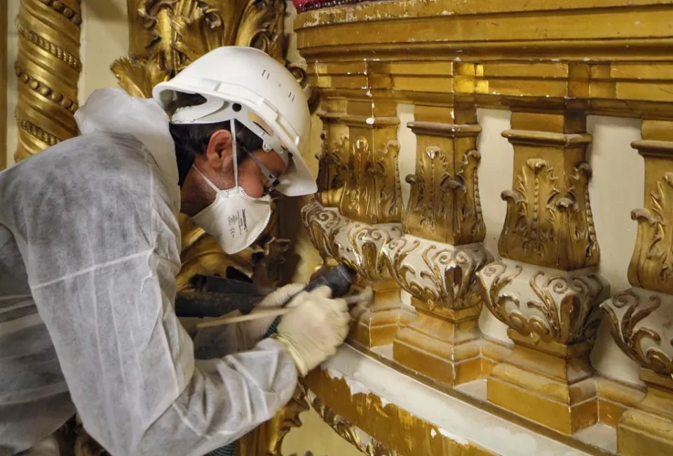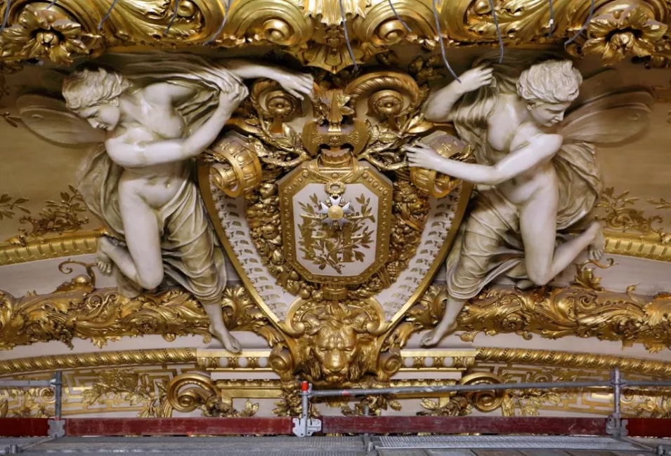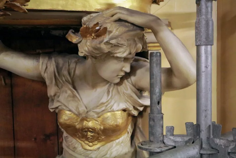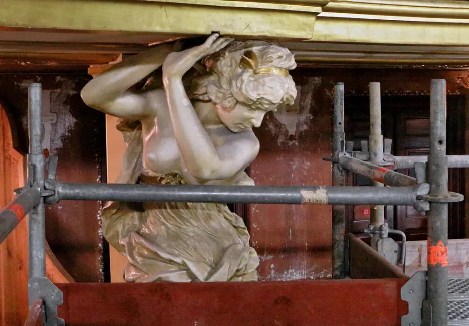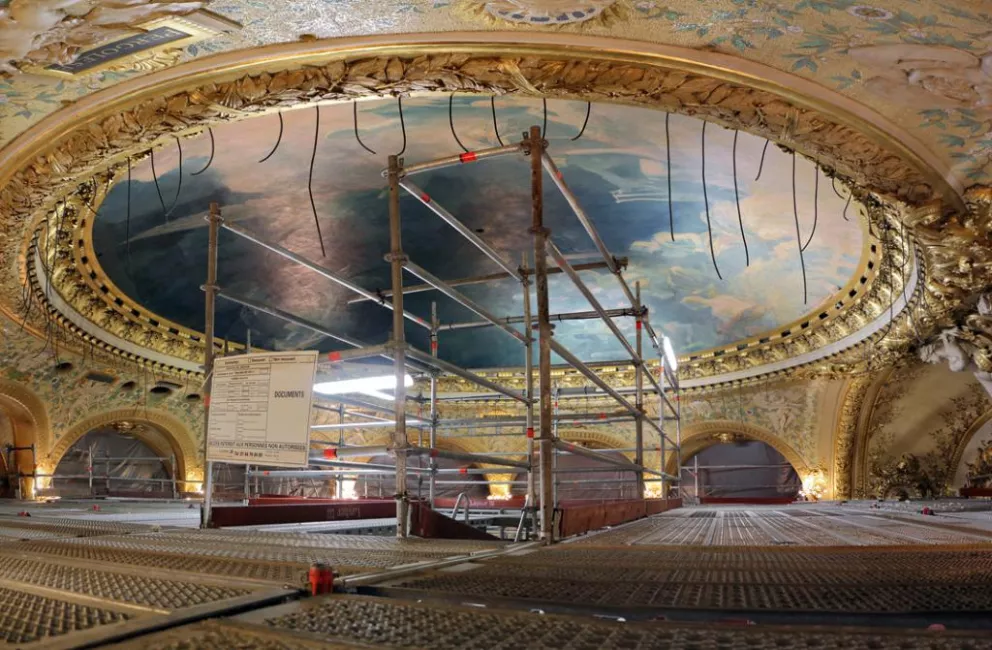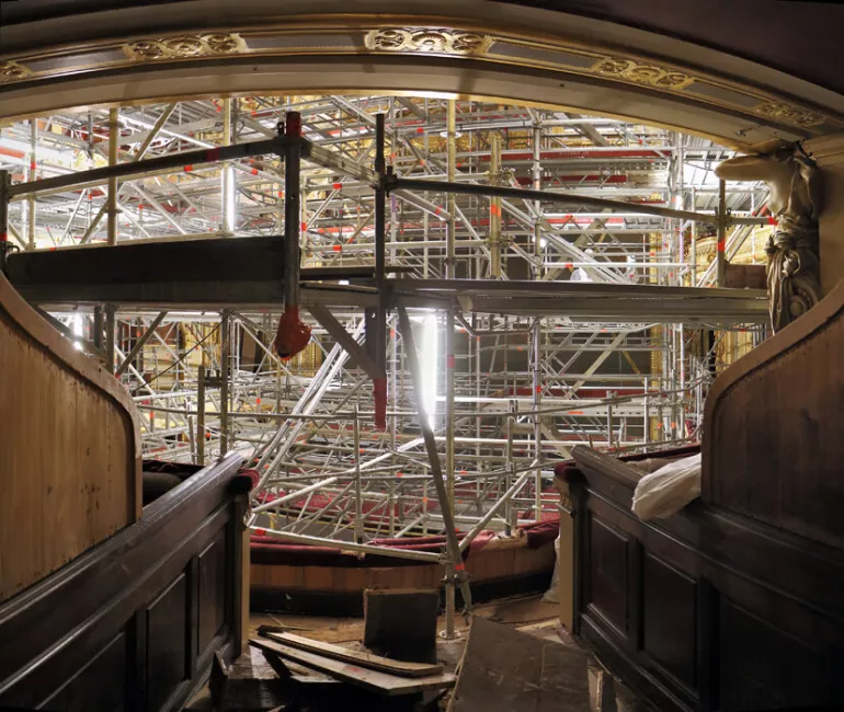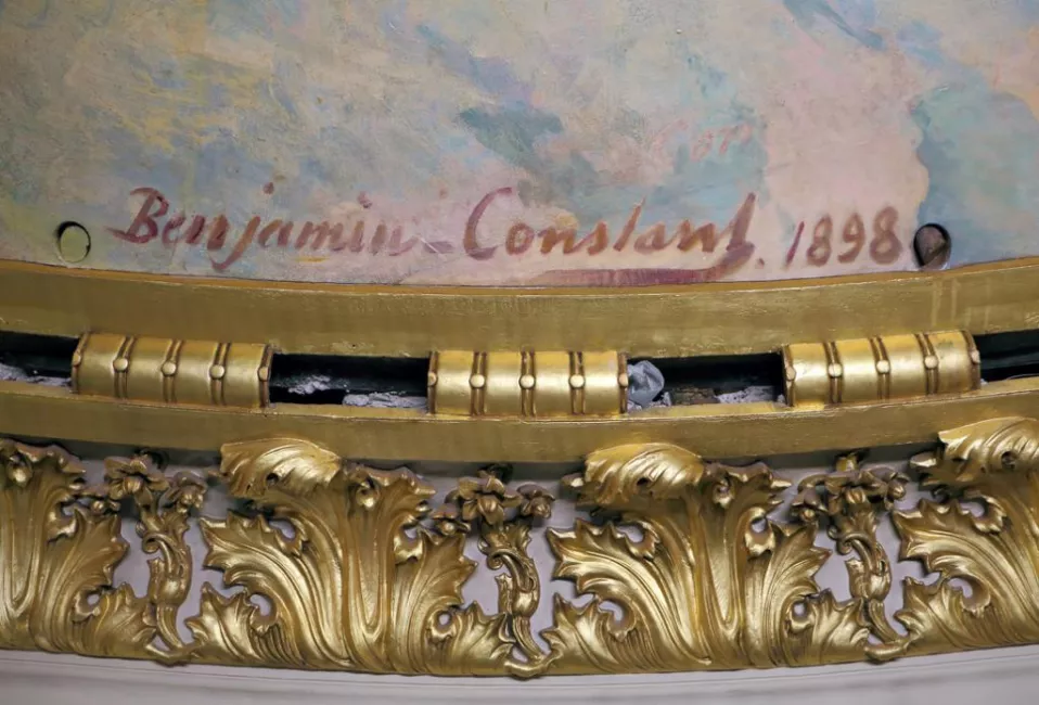 Returning to our construction site, the frieze around Benjamin-Constant's painting is studded with figures and statues. The inspiration, drawn from Greek and Roman mythologies and the artist's commitment to the Republic, is rather puzzling. It's like a link that reconciles heaven and earth. It's exactly what is achieved by this scaffolding to be dismantled in 2016. And the sooner the better even though the reopening of the auditorium will result in the return of distance from the ceiling and Benjamin-Constant's painting.