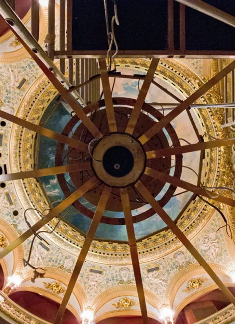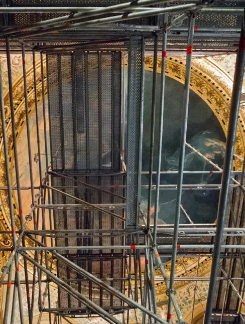 You have already been told about this metallic monster that enables those who heave themselves up to reach out their hands and almost touch the ceiling (here are two pictures taken before the installation). Unfortunately, the public is not allowed to come but whoever has the privilege to climb up there feels something extraordinary. Since the construction of the cupola and the painting of the work by Benjamin-Constant (1845-1902) titled The Glorification of Music (1898) very few have had the opportunity to be so close to the work. From the orchestra or even from the gallery it is too far up and inaccessible to the eye. As the painting radiates color and grace, it is necessary to be very close to value all its finer points.