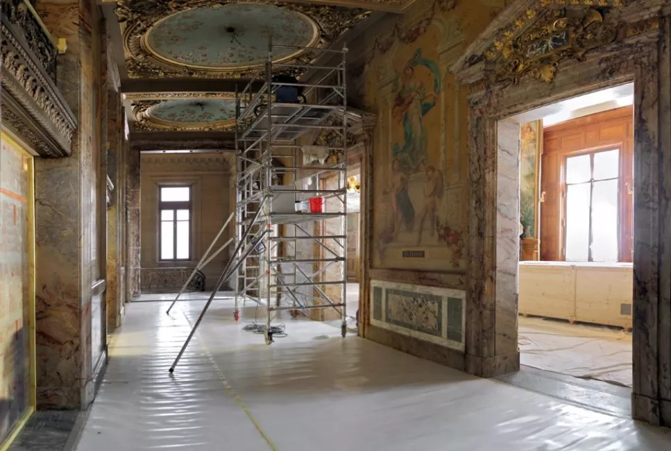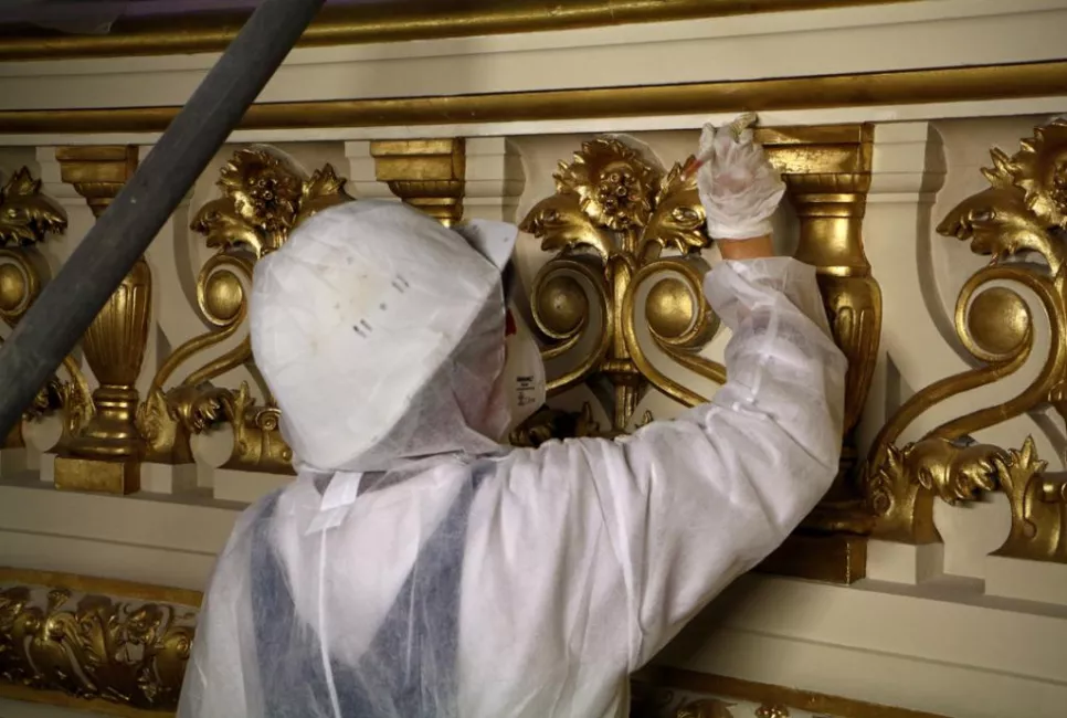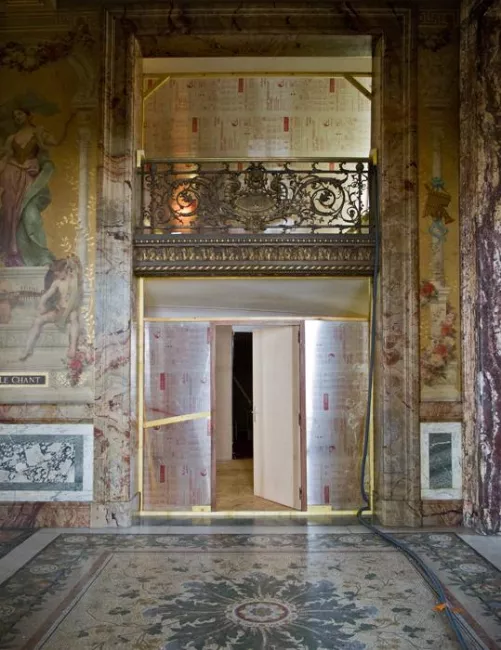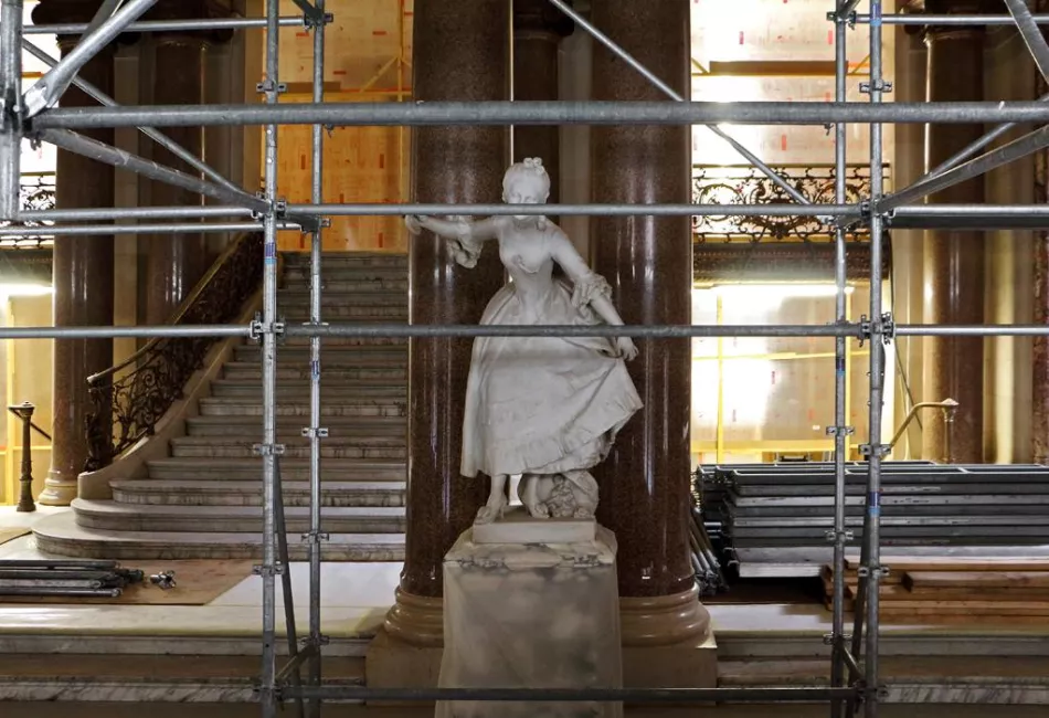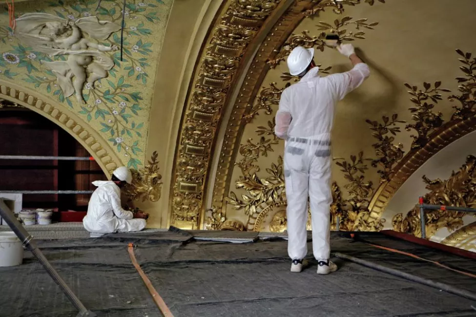 In the Salle Bizet, the marbles and gildings that have been treated contrast with those that haven’t yet. Here, the columns have been covered with a silicone film which acts imperceptibly to restore the stone to its original sheen. There, those that haven’t yet been covered bear the marks of time. The difference is striking and the 2017 operagoers, especially those who will attend the pre-performance presentations, won’t recognize this once familiar place. Cleanliness is coming back silently just like the concentration of workers giving back luster to the bas-reliefs of the proscenium arch with brush and gold leaf doesn’t tolerate any interference. A myriad of sounds on the one hand, calm and stillness on the other as well as the silence of matter and touch for a concerted action and an outstanding accomplishment. And if the guiding principle for construction sites in opera houses were: the deeper the silence the better the beautification?