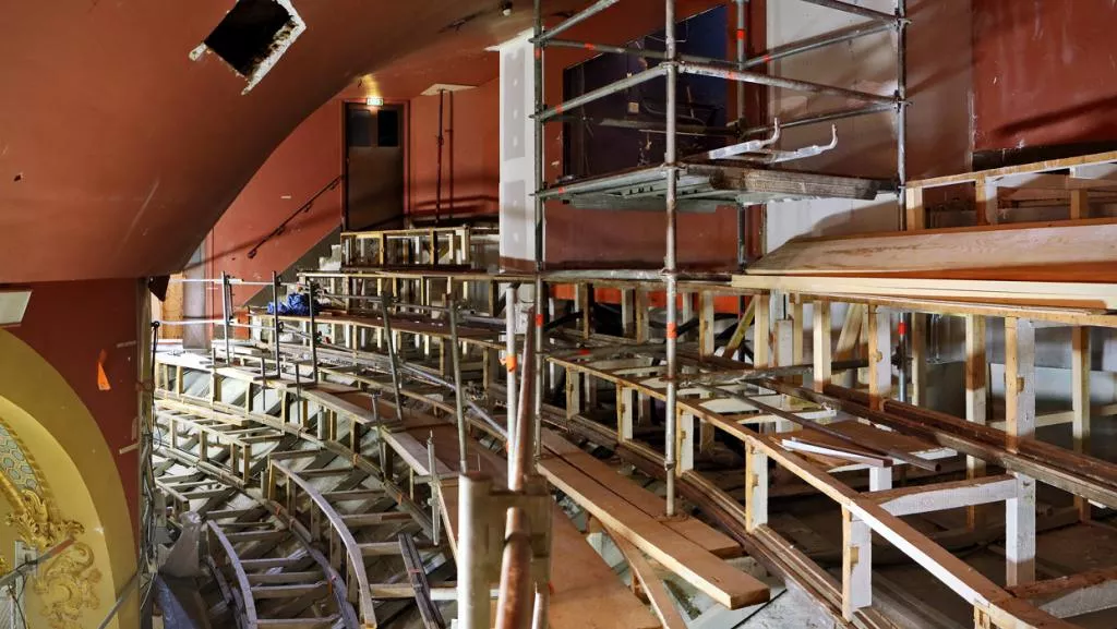 The foyer is not among the spaces of the theater to be renovated and is isolated from the construction site by impermeable boarding with one door. Yet one could perceive a new element that has never been mentioned since we began to tell you of the progress of the renovation work: noise.