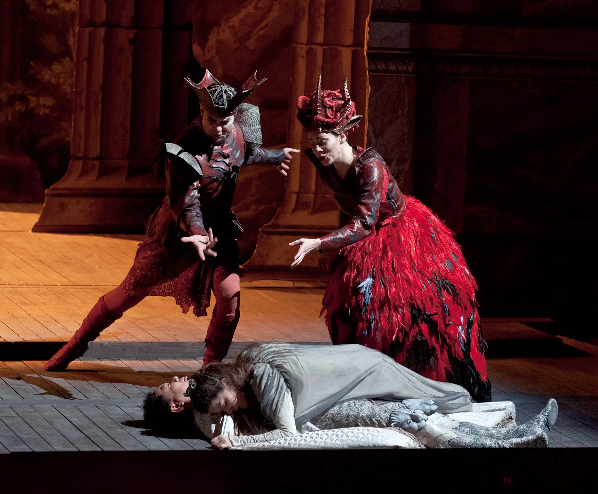 To her brother who revels in Oriane's agony, Arcabonne first acknowledges her weakness. Then Arcalaüs's anger and her own jealousy prompt her to wish for the death of the two lovers. In irons, Oriane is all the more hopeless as she still believes in Amadis's fickleness. Arcalaüs stirs up her heartache but fails to weaken her admiration for the hero. He attempts to disabuse her by showing her Amadis's corpse but Oriane's love rises anew instead: she wishes to die. Amadis and Oriane are actually only asleep but defenseless. Then appears Urgande the protective fairy. While Arcalaüs runs away in a burst of rage, Arcabonne gives herself up to the underworld. Urgande revives Amadis and Oriane who regain their initial feelings. She marries them and restores Amadis in his noble mission of paladin: fight against injustice and for freedom.