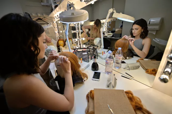 Un étage plus bas, les loges accueillent l’atelier des perruquières. Là, cheveu par cheveu, les perruques se nouent autour d’un tulle qui viendra avec perfection entourer le visage de chacun des artistes. Grandes élévations en poil de yack, couleurs, coiffures complexes, les perruques les plus réalistes côtoient les plus fantaisistes dans cet atelier où la minutie crée des chefs-d’œuvre.