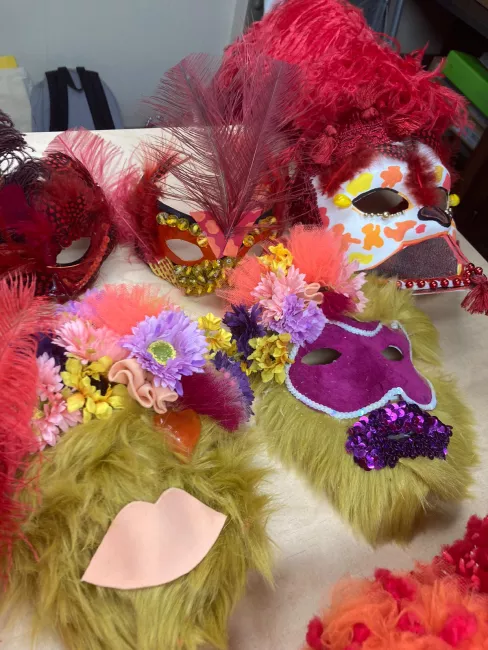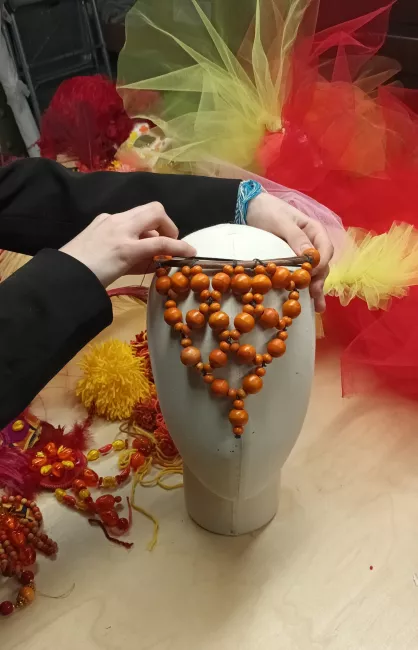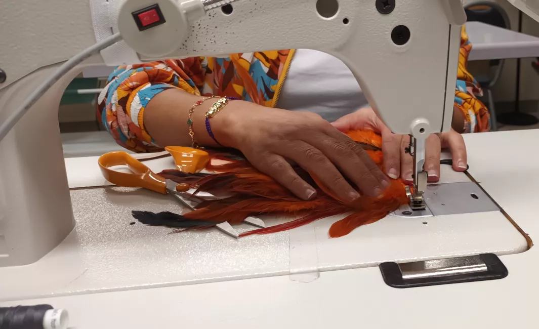 À une autre table, dégainant son pistolet à colle, Sohane, lycéenne de 15 ans, nous confie apprécier ce travail manuel : « J’ai fait trois masques. La méthode est toujours la même : je prends une base de masque que je peins, puis je colle des perles et différentes pièces de tissus, je peux aussi mettre des colliers et des plumes. J’ai aussi fait un bijou de tête avec un fil de laiton sur lequel j’ai positionné un collier plastron. J’ai aussi fait des pompons que j’assemble pour finaliser une belle coiffe pompons. La couture m’a toujours intéressé, j’aime utiliser mes mains et j’aimerais en faire mon futur travail. Créer avec tout ce qui me tombe sous la main, voilà ce qui me plaît. »
