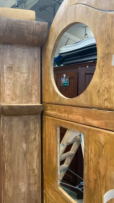 Ces horloges ne sont pas seulement des éléments scénographiques : ce sont de vrais costumes et les comédiens joueront dedans pendant presque toute la durée du spectacle. Les horloges comportent des charnières, des portes et des fenêtres avec de petits rideaux qui s’ouvrent et se ferment, et sont équipées de poignées pour faciliter la prise par les comédiens. Des bandes LED ont également été ajoutées à l’intérieur, permettant de les éclairer.