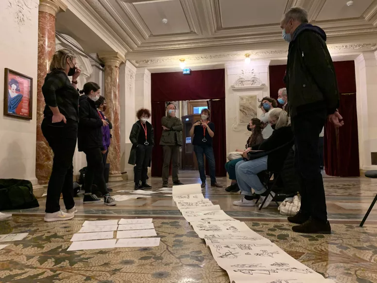 Après une présentation de l’Opéra Comique et une visite de ses espaces emblématiques, les participants s’installent en salle Favart pour assister à la répétition. Du carnet de croquis au rouleau, chacun sort son support et utilise une technique de dessin afin de saisir le corps et son mouvement. Chacun a pu saisir le fugitif à l’aide de différentes techniques de dessin et retranscrire son propre regard.