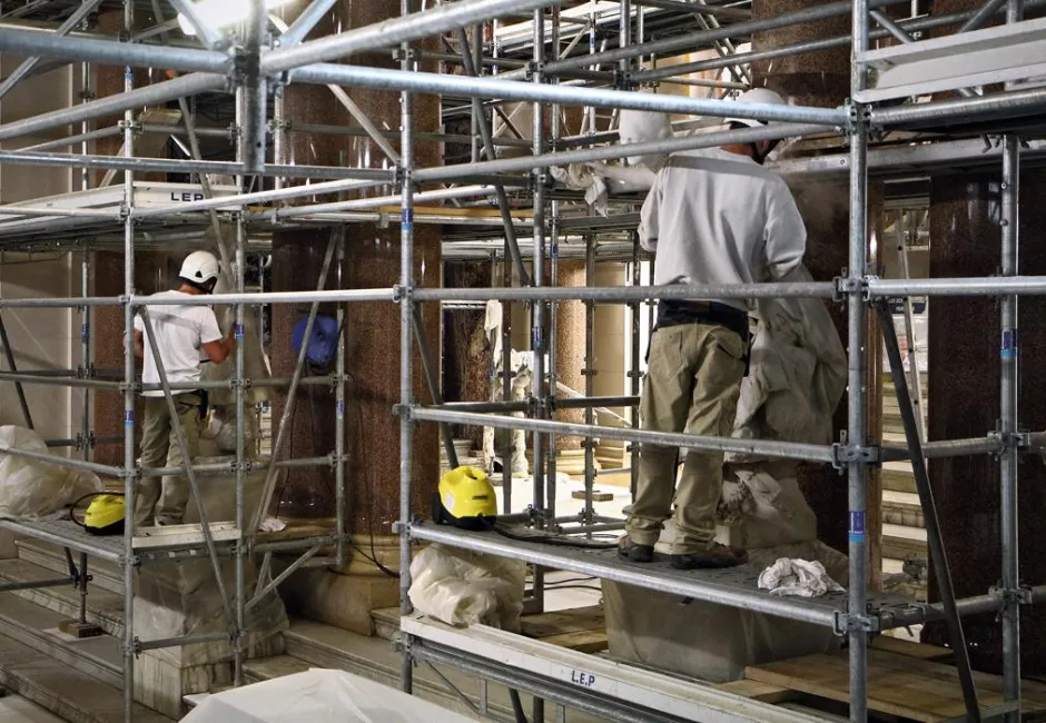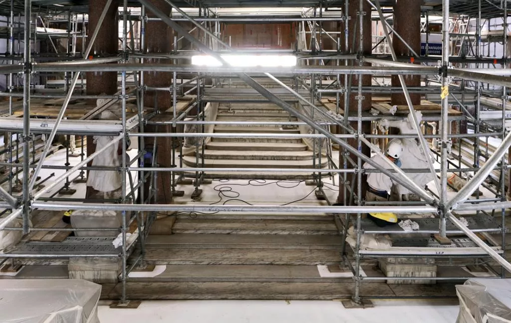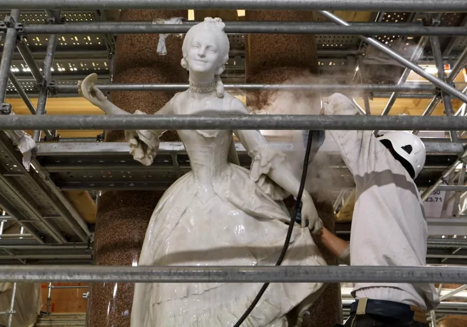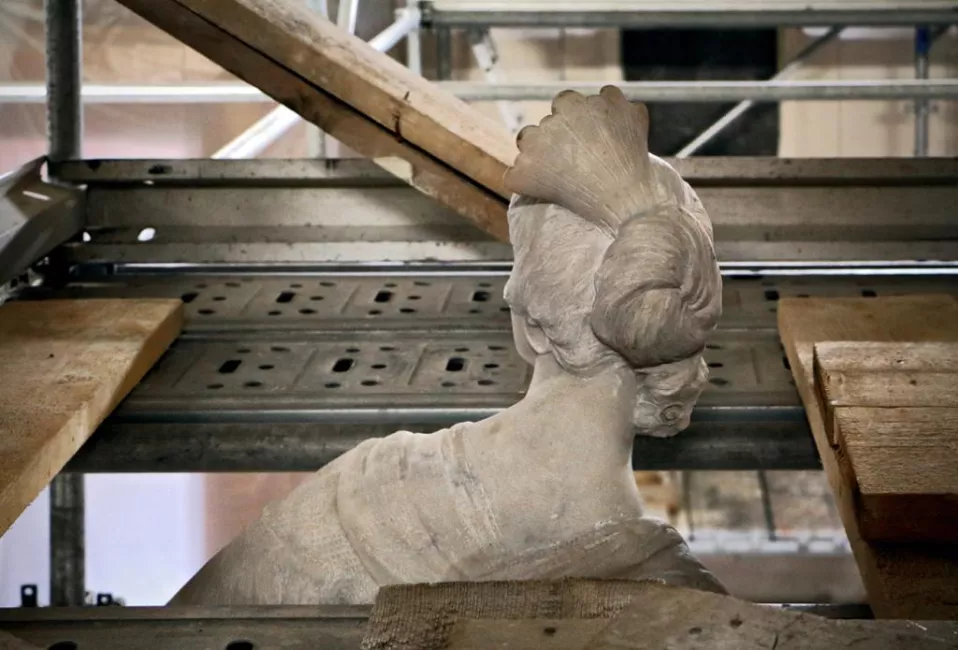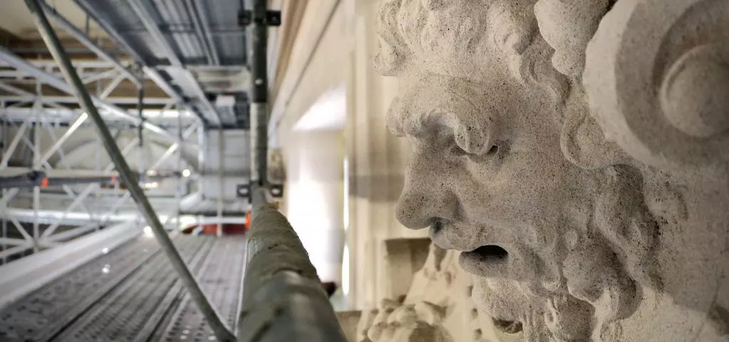 Et bien les travaux Favart ce sont 8500 m² au total revisités par 13 entreprises représentant seize corps de métiers, 307 locaux, 15 escaliers pour partie restaurés, ce sont 80 compagnons par jour en moyenne qui arpentent l’édifice, un volume de béton de 210m3 qui aura été coulé, 2,3 km de gaines de ventilation qui auront été posées, 2,7km de canalisation de plomberie vérifiées et parfois changées, 330 portes restaurées ou remplacées, 700 m² de moquette changés,… et l’on pourrait égrener ainsi la liste hallucinante des choses qui auront été reprises ou apportées. Favart fait peau neuve et en réalité, il est pratiquement impossible d’en rendre compte. Ceci d’ailleurs n’a pas vraiment d’importance. Il suffit de jeter un œil sur notre chère Manon, celle qui accueille le public dans le hall d’entrée. Là encore la photo donne la mesure de ce qui se passe. Manon reprend son teint diaphane et la pierre son caractère expressif. Les chiffres ne donnent qu’une faible idée de la mutation qui s’opère. Logique car au-delà du confort et de l’aération, c’est d’un embellissement, c’est-à-dire de choses fugaces et peu quantifiables, dont il est aussi question.