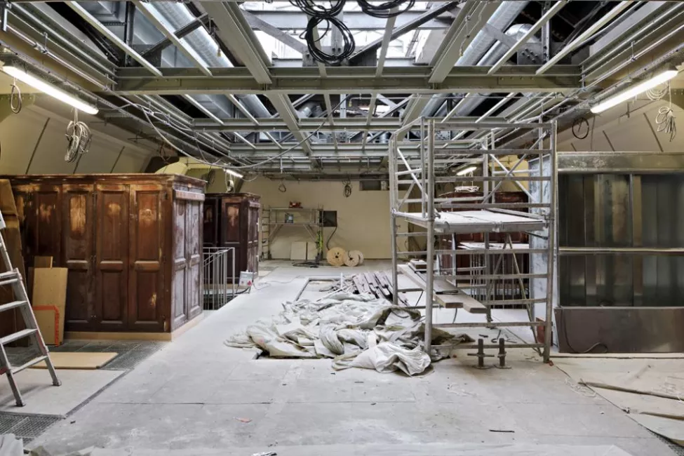 Lors de la dernière livraison des nouvelles du chantier, nous vous parlions du démontage de l’énorme carcasse de tubes, passerelles métalliques et autres échelles d’échafaudage qui remplissaient la salle Favart du sol au plafond. Et nous vous parlions des bruits qui accompagnaient cette nouvelle phase des travaux. Les photos ci-contre donnent la mesure de ce qui se passe. Jour après jour, le niveau de la ferraille baisse. Le premier balcon est atteint, encore un peu et les démonteurs toucheront terre. C’est un peu comme le promeneur quand il accompagne de reflux de la mer à marée basse : il prend conscience de l’énorme masse liquide qui occupait l’espace en foulant le sable mouillé en lisière d’écume. C’est pareil. Favart vidé de ses tubulures, même sur deux niveaux, voilà qu’on se prend tout à coup à appréhender l’énormité de ce qui a été entrepris et continue de s’entreprendre. Mais au fait c’est quoi ce chantier ?