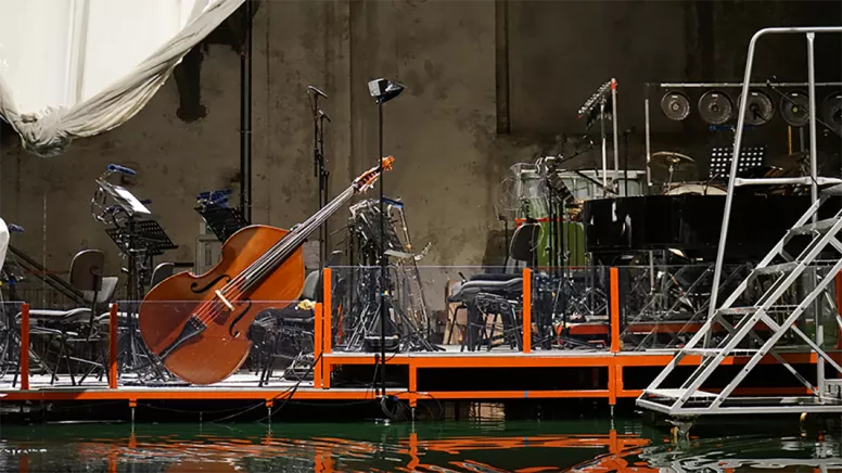 Mardi 25 juillet 2017, 16h. Le matin, il n’y avait rien sur le plateau. A présent s’y trouve un bassin d’environ cinq mètres sur deux, rempli d’une eau dont l’obscurité de la salle permet de voir la fluorescence verte émeraude. A l’intérieur de ce bassin, Sarah Maria Sun, soprano, et Niels Bormann, comédien, semblent s’accommoder dignement des énormes bottes de pluie dont ils sont affublés pour l’occasion. Pour compléter sa tenue, Niels Bormann arbore fièrement un masque de réalité virtuelle sur les yeux, relié à une sorte d’ordinateur qui le pilote sans doute et qu’il porte sur le dos comme un sac d’écolier. C’est d’ailleurs l’excitation de la nouveauté et la candeur de l’enfance que l’on lit dans les yeux de chacun face à ces bizarreries technologiques. Dans chacune de ses mains, deux manettes lui permettent de dessiner son monde. On voit projeté derrière lui ce que lui voit tout autour. On se sent presque gêné de pénétrer à ce point sa perception, de lui voler ses yeux, de lui prendre son regard ; puis on se souvient vite que l’image projetée passe de toute façon elle aussi par nos yeux, qu’ils la transforment, et qu’elle sera toujours nécessairement différente de celle que Niels Bormann voit lui-même. Alors ça va mieux.