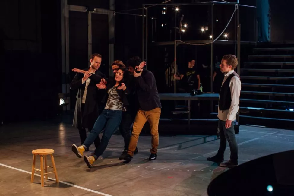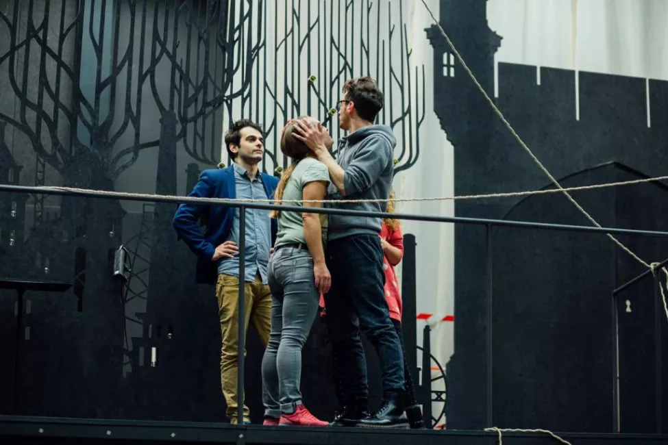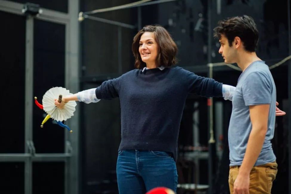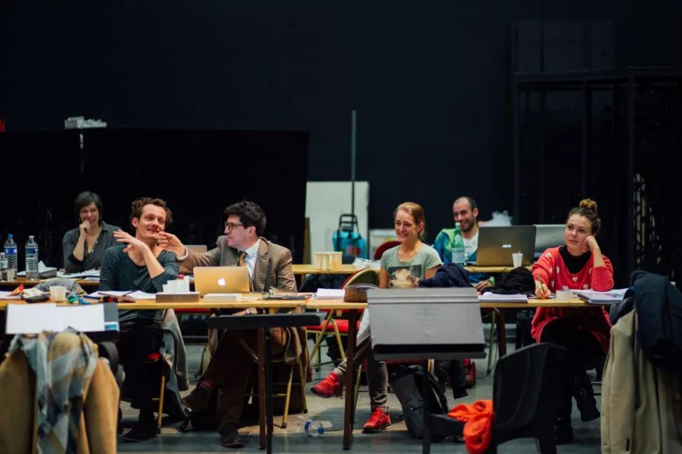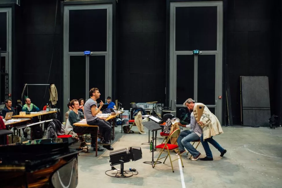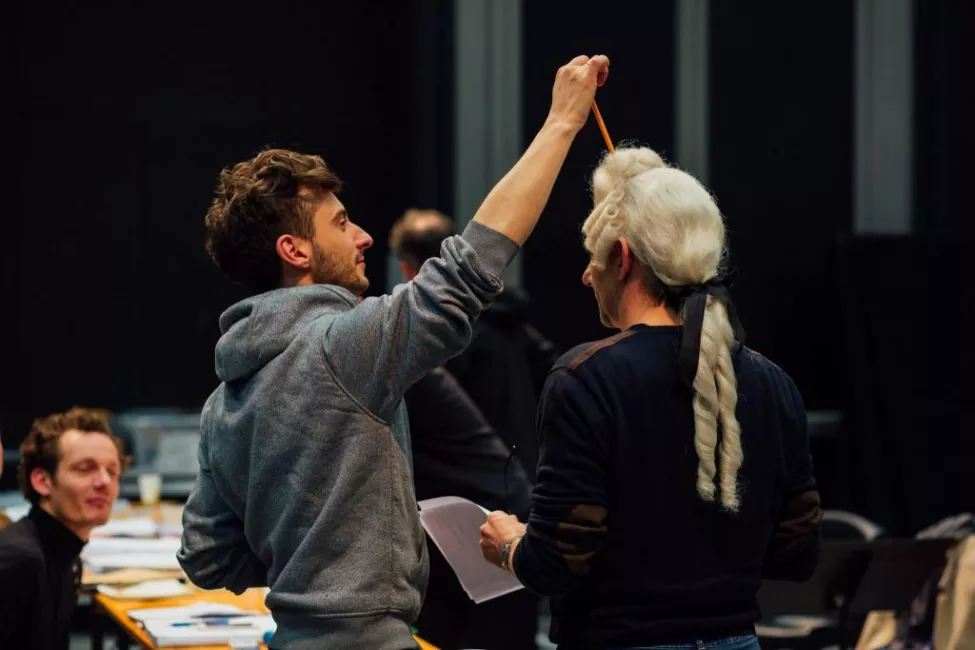 C’est entre des boîtes de kleenex et des échanges de remèdes variés contre la grippe et le rhume, que le travail reprend jeudi 12 au matin. Derrière les pupitres, Marie-Ève Munger et Alix Le Saux font face à l’équipe de Thomas Jolly pour préparer la première scène de l’acte II pendant qu’un peu plus loin, Marianne Crebassa fait des essayages avec Sylvette Dequest, la costumière. Après un travail « à la table », comme il est dit dans le jargon théâtral, autour de la question de la relation unissant Elsbeth et sa suivante tour à tour amie et confidente, Thomas Jolly envoie « Marie-Eve dans le décor ! » – invitant à des essais de placement dans l'espace. Marianne Crebassa rejoint le groupe juste à temps pour donner sa réplique, puis arrivent Franck Leguérinel (le Roi), Loïc Felix (Marinoni), Jean-Sébastien Bou (le Prince) et Bruno Bayeux (Rutten). Dans un demi-chanté demi-parlé, les comédiens parcourent le début de l’acte II. Des moments d’apparent chaos font rire la petite assemblée que nous sommes : tous arrêtent ce qu’ils sont en train de faire pour regarder la fin de la scène 10, où les personnages, qui devraient chanter le quintette, disent leurs textes à une vitesse vertigineuse. Thomas Jolly orchestre alors un véritable « ballet de mains » burlesque pour jouer du quiproquo de la situation (Marinoni étant déguisé en Prince, le Prince en Marinoni l'aide de camp cherchant à séduire Elsbeth), où chaque personnage désigne les autres en cadence.