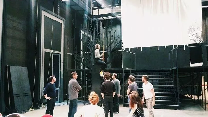 Après le déjeuner, on ressent tout à coup une sorte de frénésie : Laurent Campellone, le chef d'orchestre, est derrière son pupitre face à la scène et Martin Sureaux au piano ; la première répétition de l’acte II va commencer. On met en place un long voile qui sera celui du mariage d'Elsbeth. Thomas Jolly en profite pour donner des éclaircissement sur le symbole de ce voile qui sera cousu durant toute la scène par les suivantes de la princesse : dans les mains de Flamel passe « le fil du destin d'Elsbeth » selon la jolie formule du metteur en scène. La répétition commence enfin sous les ordres des deux chefs d’orchestre. Si Laurent Campellone dirige les voix des chanteurs avec ses mains, Thomas Jolly les accompagne avec ses mimiques et ses gestes, peut-être par un effet curieux de mimétisme. Il transmet aux interprètes les sentiments et les intentions des personnages, et se déplace lentement autour de la scène, l’arrêtant à plusieurs reprises. « Essayons quelque chose » dit-il souvent après quelques secondes de silence. Parfois, dans la foulée, et face à une difficulté de mise en scène – par exemple le fait que les chanteurs puissent toujours voir le chef d’orchestre–, il annonce une proposition complètement nouvelle qui semble résoudre le tout, avec une simplicité presque magique. Même si Thomas Jolly a ses idées sur Fantasio, il écoute aussi ce que les corps des chanteurs sur la scène lui disent, ce qu’ils inspirent. « La cascade à la fin, c’était un accident ou une proposition ? » demande-t-il à Jean-Sébastien (le Prince) après avoir laissé les choses se dérouler sur le plateau. « Une proposition ! » confirme le comédien. La cascade est retenue et la répétition continue jusqu’à 17h30. L’ensemble de l’équipe se sépare pour prendre un peu de repos, et certains même se soigner de leur rhume ou leur grippe pour reprendre le lendemain les répétitions de Fantasio.