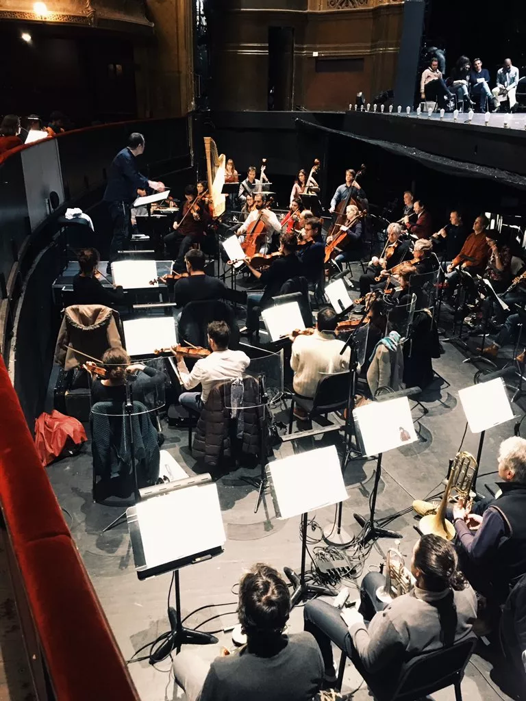 Quelques jours seulement après une répétition générale avec piano, l’équipe de Fantasio rencontre les musiciens issus de l’orchestre philharmonique de Radio France. Qu’est ce qu’on appelle une répétition « à l’italienne » ou tout simplement une « Italienne »? Costumes, décors et textes maitrisés par les interprètes on peut se demander quel est l’intérêt d’un retour au format concert, frontal sans trop d’effet de mise en scène si ce n’est les automatismes que chacun a acquis au cours du dernier mois. Si l’appropriation totale de la scène n’est plus qu’une question d’infimes détails pour les solistes et les choristes, un nouvel espace s’ouvre à eux, un dernier engrenage caché de la machine opératique : la fosse et ses habitants.