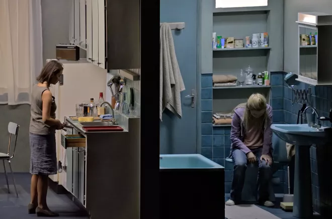 L’idée que j’ai formulée lors de cette séance de travail était d’offrir une simultanéité de points de vue sur les actions, en montrant les trois étages de l’immeuble où se déroule l’action non pas un à un, mais ensemble. Vues en simultané d’actions banales, certaines actions primordiales de l’histoire sont ainsi enrichies. Ce contrepoint d’actions renvoie d’ailleurs à l’écriture musicale il me semble.