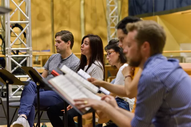 Francesco Filidei : « On lisait le dialogue une ou deux fois. Au violoncelle, Séverine Ballon créait des ambiances sur mes indications. On relisait. Chaque matin, j’esquissais le chant avec le texte. L’après-midi, j’écrivais rapidement la mélodie au piano, comme un peintre d’après modèle, en cherchant à rendre justice à la vie et au souffle de chaque interprète.