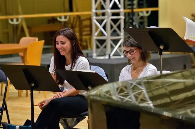 Le lendemain, on jouait l’esquisse, on retouchait. Joël y intégrait le temps nécessaire pour les déplacements et les actions scéniques. On enregistrait le résultat. Ensuite, je reportais l’ensemble à l’ordinateur et je faisais une maquette. Cette première étape de la composition, scène par scène, est allée assez rapidement. Elle a permis d’encapsuler la présence vivante des interprètes engagés pour les ateliers. »