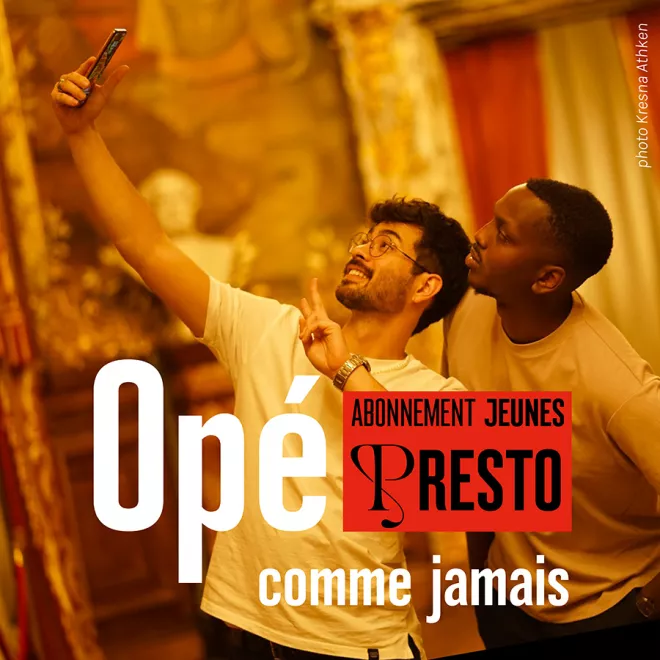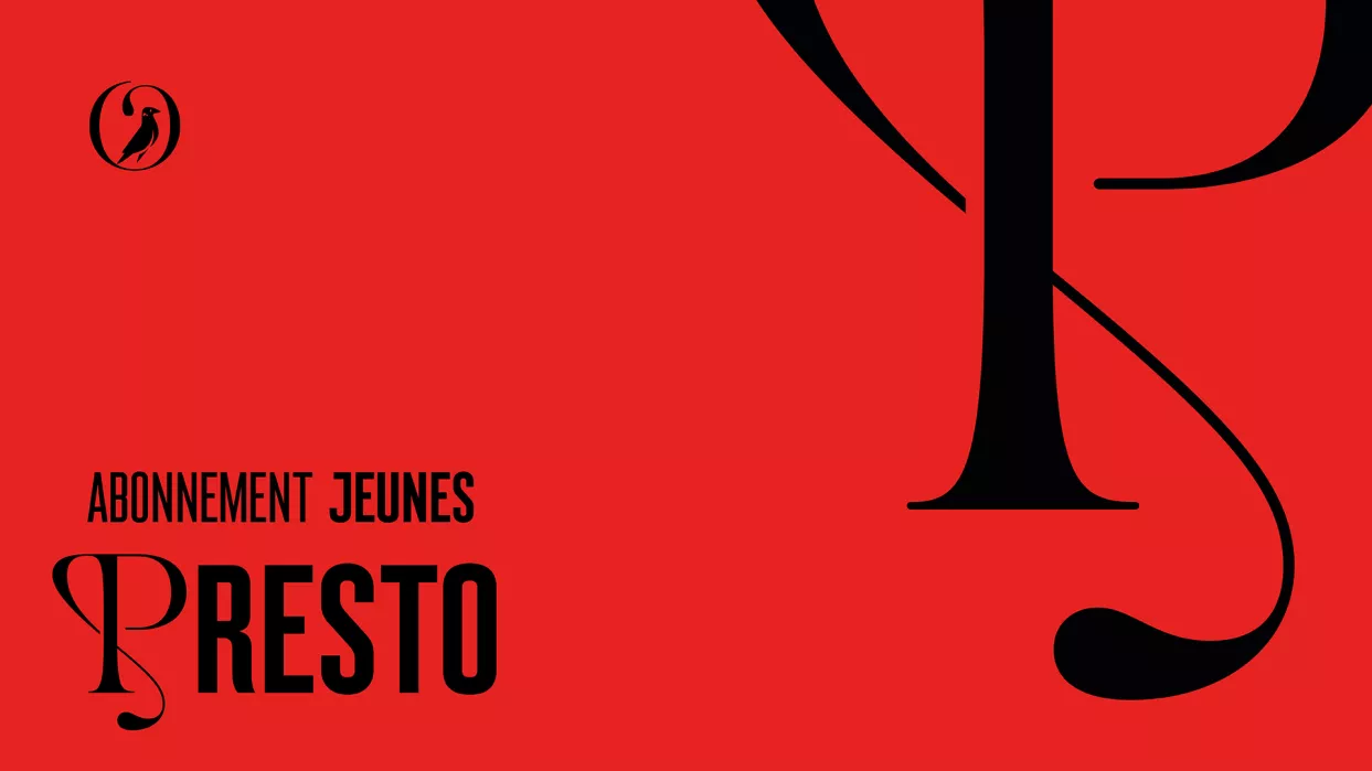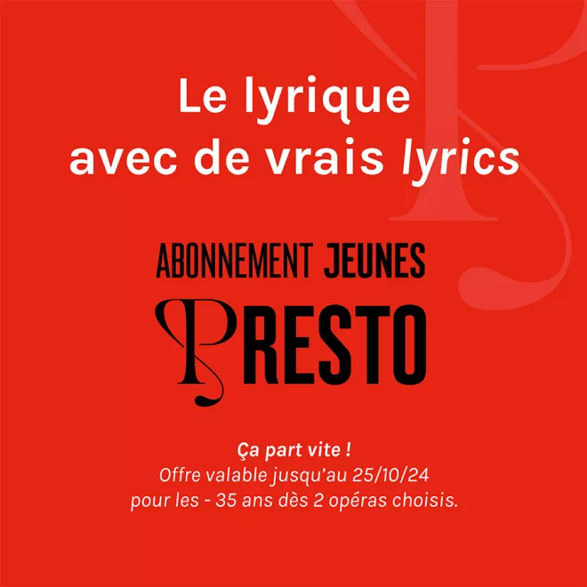 Si vous avez moins de 35 ans, devenez un abonné Presto en choisissant 2 opéras de la saison 24/25* et accédez à des tarifs préférentiels pour réserver vos places (25€ au lieu de 50€ en cat. E et 35€ au lieu de 80€ en cat. D).