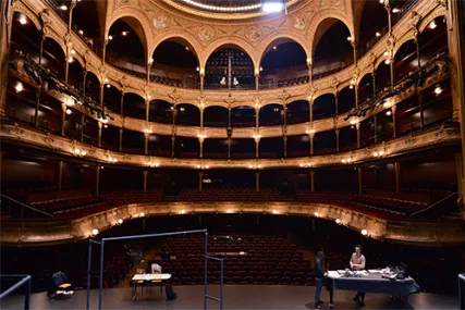 Dans l’auditorium, le public a les yeux rivés sur l’estrade où sont assis le metteur en scène, la dramaturge (Katja Krüger) et la jeune mezzo-soprano qui endossera le rôle-titre de Fantasio. Au premier rang, sept autres regards, à la fois complices et critiques observent ce qui se joue là, entre l’estrade et la salle. Ils sont sept étudiants de l’école des hautes études en sciences sociales (EHESS) accompagnés de Karine Le Bail (CNRS-CRAL). La chercheuse a engagé un programme de recherches sur le chantier de réhabilitation de l’Opéra Comique, chantier d’une ampleur inédite qui s’accompagne d’une reformulation profonde par la nouvelle équipe dirigeante des conditions de ce qui fait scène aujourd’hui. Dans le cadre d’une convention de recherches avec l’EHESS, un appel à candidatures a été lancé au sein des filières « Musique » et « Arts et langages » de l’école du boulevard Raspail. Sept profils sont sortis du lot, sept points de vue différents sur le processus de recréation de l’œuvre, absente des scènes françaises depuis 1872, mais aussi sur l’idée de chantier, de la pierre au concept. Histoire, musicologie, dramaturgie, sociologie, scénographie, narratologie et acoustique, sont autant de cartes dans les mains des jeunes chercheurs qui s’immergent depuis un an dans l’ombre de Fantasio et de l’Opéra Comique. Bénéficiant du délai exceptionnel accordé à l’équipe artistique et du soutien institutionnel du LabEx CAP, les Fantasept (ainsi surnommés par Alexandre Dain, collaborateur artistique) entendent aussi donner une nouvelle image de la recherche universitaire en proposant une approche immersive de leurs investigations sous la forme notamment d’un Web documentaire.