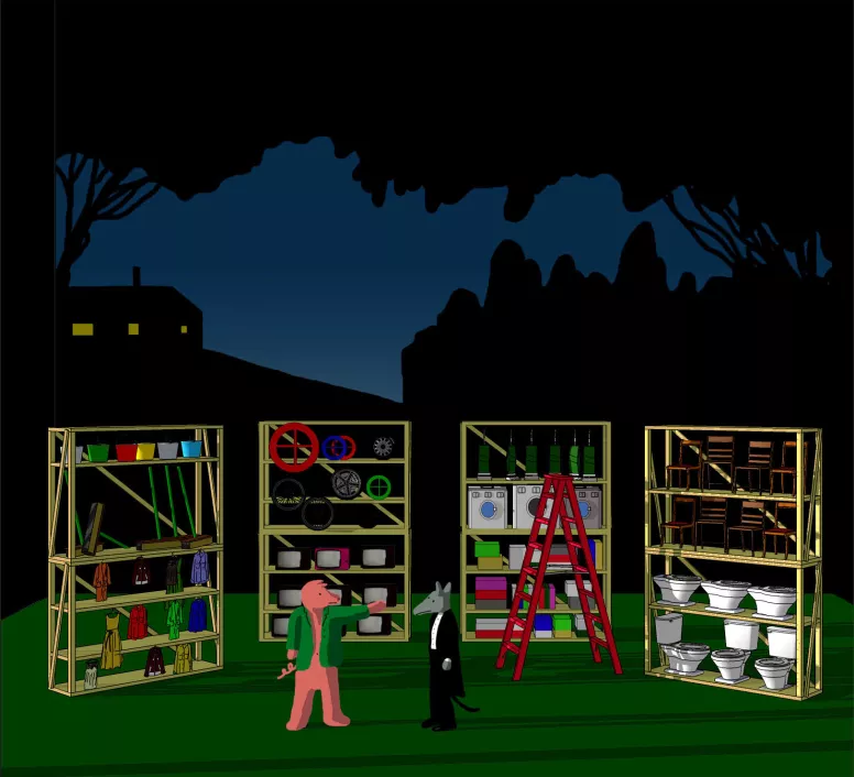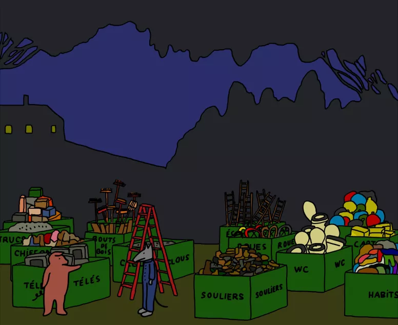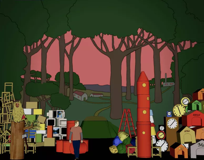 La plupart des éléments du décor ont été fabriqués en carton ou ont été achetés dans une brocante. Sur scène, tu pourras aussi remarquer des ordinateurs allumés. En les regardant bien, tu découvriras des images ou des vidéos en lien avec le spectacle ! Durant le spectacle, les tas de déchets que Ferdinand a pris soin de trier se retrouvent mélangés par les multiples passages des personnages ainsi que par la construction de la fusée de Mercibocou et Nouille. Si tu observes la scène à la fin du spectacle, tu verras tous les détritus étalés sur le sol.