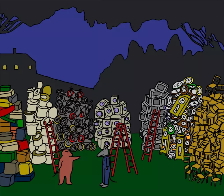 C’est alors que lui vint la troisième idée, celle qui a été retenue pour le spectacle : empiler les objets les uns sur les autres, par ensembles et en variant les couleurs : les niches avec les niches, les ordinateurs avec les ordinateurs…