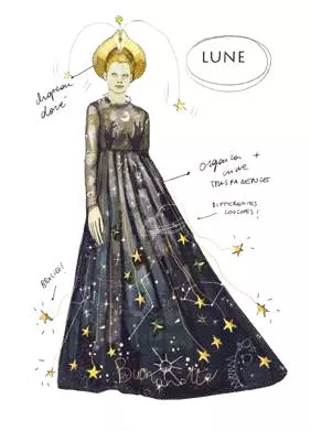 Le rôle de chaque personnage peut encore être précisé par la texture, la coupe, les volumes du costume. Cinzia / La Lune dévoile et éclaire, son costume aussi. Pasithée s’occupe de son époux, le Sommeil, en véritable aidante : son costume évoque l’infirmière.