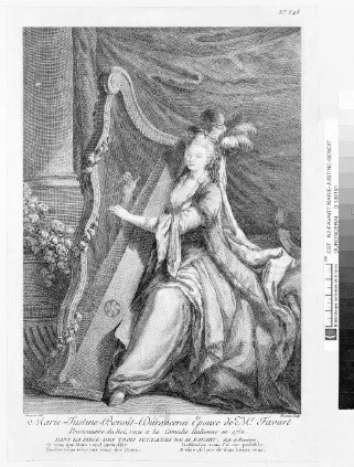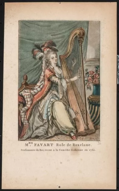 La pièce à succès des Trois sultanes ayant été popularisée par l’estampe, nous pouvons comparer diverses représentations de la scène où Roxelane chante en s’accompagnant de la harpe (acte II, scène 15). L’intérêt porte moins sur l’interprète – les visages sont peu ressemblants, contrairement à la Bastienne de Vanloo – que sur la disposition générale des personnages, les accessoires et les costumes. […] On y voit Roxelane à la harpe chanter en duo avec Délia tandis qu’Elmire danse sans parvenir à attirer l’attention de Soliman. Ce sont en réalité deux moments successifs qui sont ici représentés simultanément. Les habits des trois sultanes sont assez similaires, avec des bottes courtes et des pantalons bouffants très apparents sous de longues robes ouvertes sur le devant, des vestes tombant jusqu’à terre, pour certaines bordées de fourrure, des turbans ornés de plumes. On note une grande similitude entre les habits du sultan et ceux des sultanes.