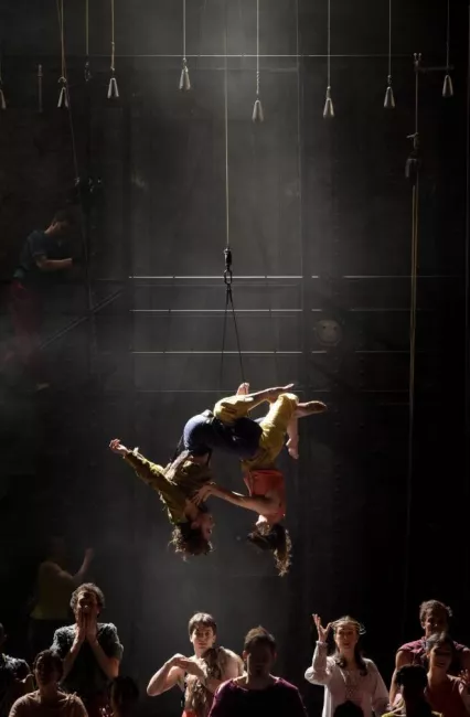 “Louise Moaty and Raphaëlle Boitel bring the circus arts among the singers. […] They use circus equipment: rope, Chinese mat, fabrics. This adds poetry and rhythm to an often very dark work.”