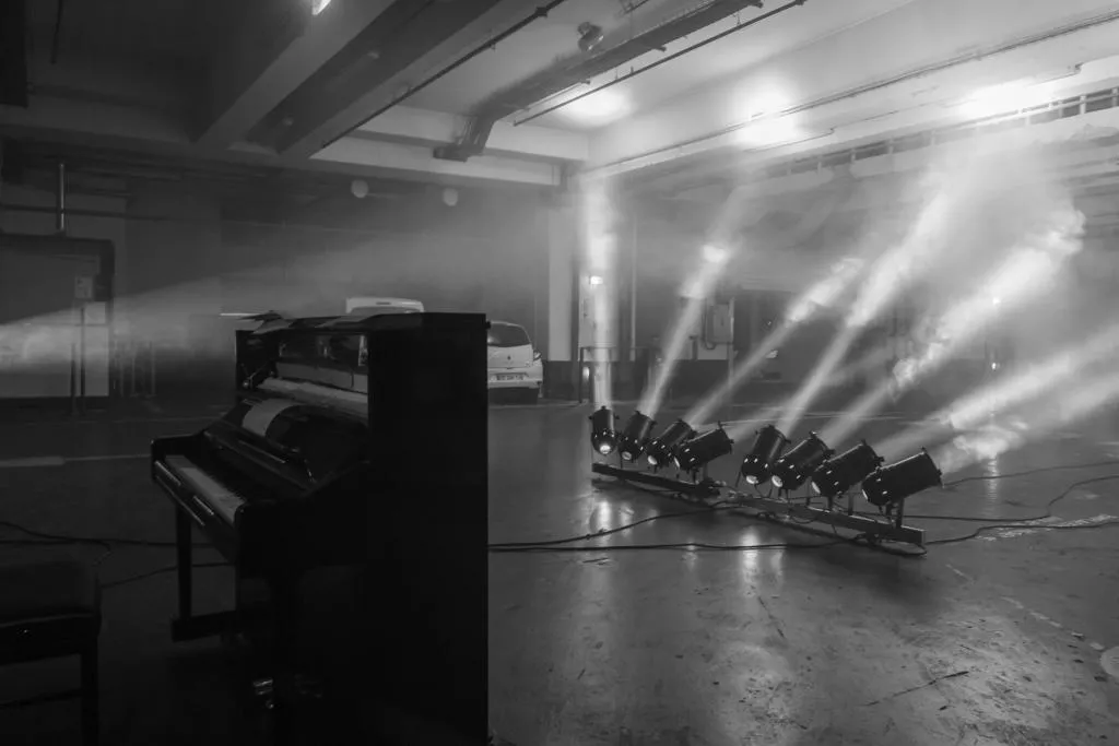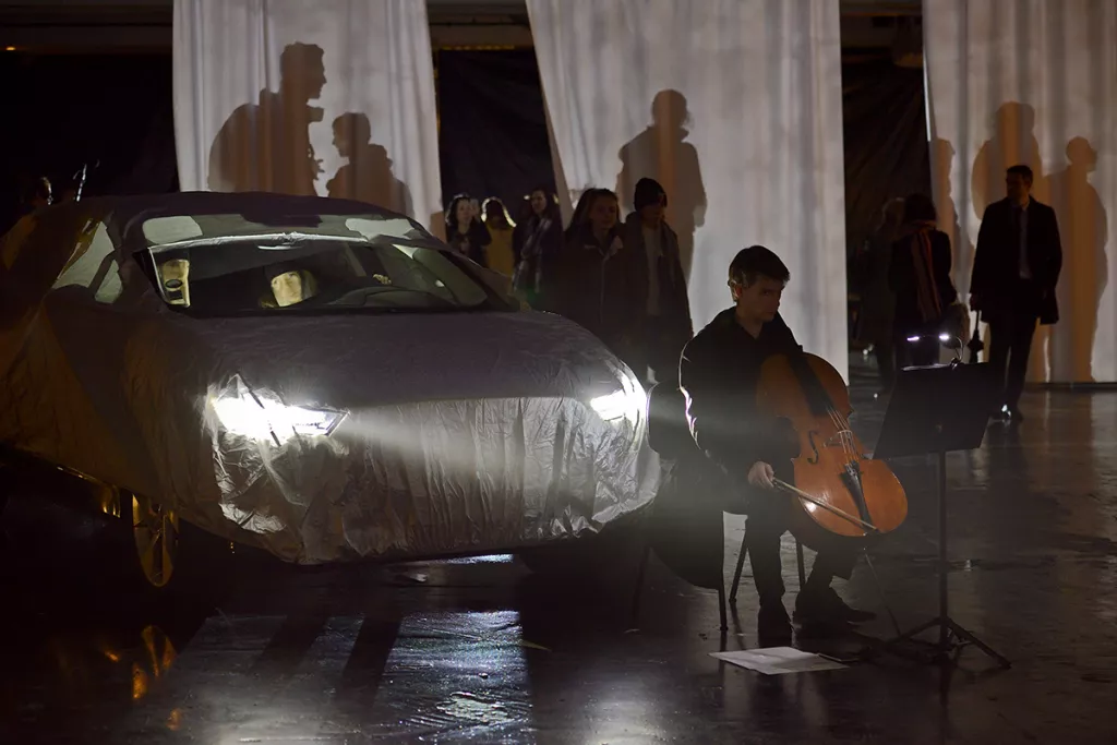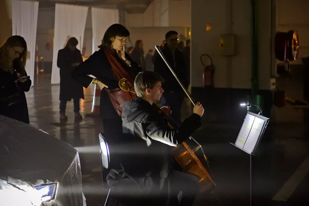 Lumières, âmes errantes, musiciens et comédiens font ainsi vivre cet opéra d’un nouveau genre dans lequel les mouvements du public font aussi partie de l’œuvre, transformant le parking du Centre Pompidou en une antre dantesque où résonnent les voix de la soprano Karen Vourc’h, accompagnée de vingt-huit choristes de l’ensemble accentus, la musique de treize violoncelles, dont celle de Sonia Wieder-Atherton, six pianos, percussions et guitare électrique, dans une coordination artistique signée Plein Jour.