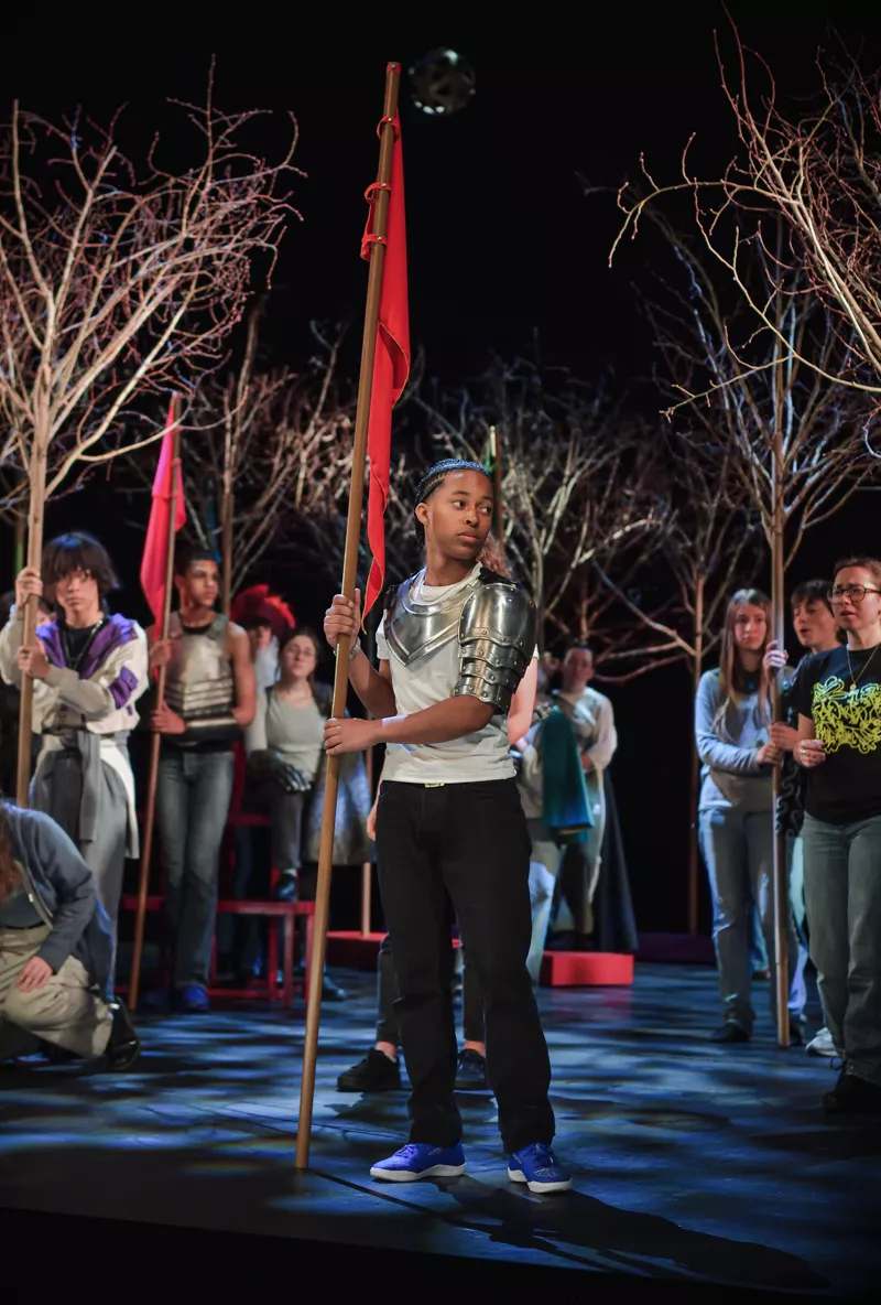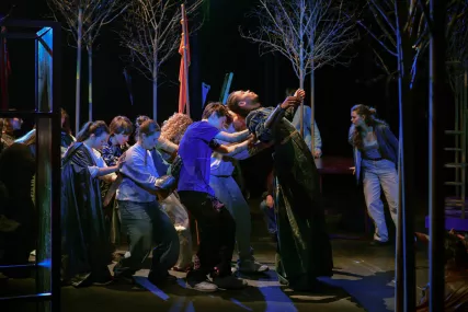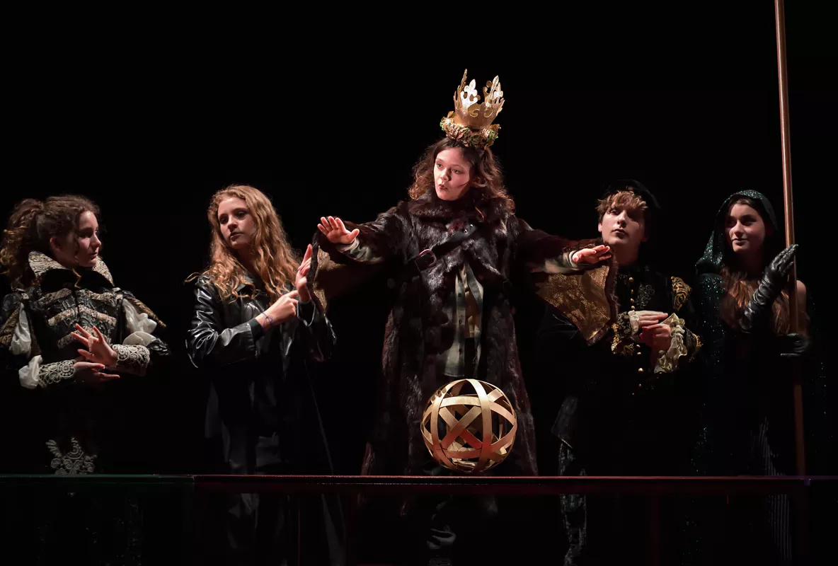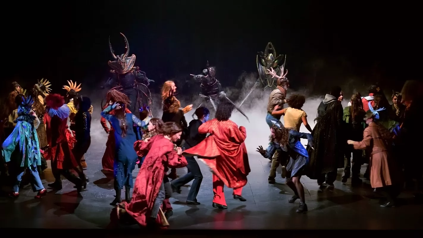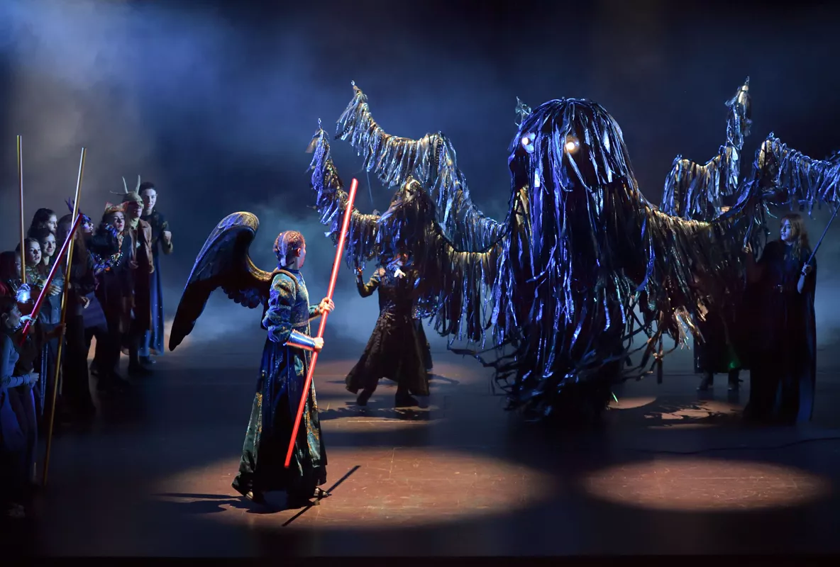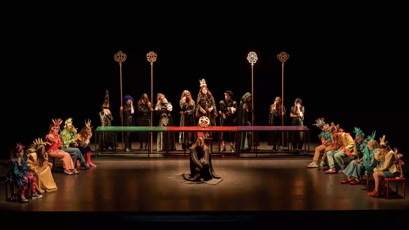 Un décor baroque en mouvement - La Maîtrise populaire ouvre en grand à ses jeunes artistes le plateau de l’Opéra comique. Pour les accompagner dans la construction de ces récits, Adeline Caron a conçu des éléments mobiles dont les agencements changent au fil des scènes : arbres portatifs, tables devenant des portes, chariots devenant des barques, ciel étoilé, océan de tissu argenté, grand monstre martin à combattre, marionnette géante animée par cinq enfants. Tous ces éléments empruntent à l’imaginaire baroque et à celui des contes, avec lesquels les jeunes artistes vont construire leur grande affabulation.
