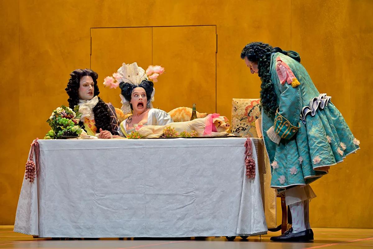 Direction musicale Théotime Langlois de Swarte • Mise en scène, Jérôme Deschamps • Avec Flore Babled/Pauline Gardel, Jean-Claude Bolle Reddat, Sébastien Boudrot, Vincent Debost, Jérôme Deschamps, Pauline Deshons/Bénédicte Choisnet, Aurélien Gabrielli, Guillaume Laloux, Josiane Stoleru, Pauline Tricot/Lucrèce Carmignac, Sandrine Buendia / Natalie Pérez / Constance Malta-Bey, Nile Senatore, Lisandro Nesis, Jérôme Varnier / Nabil Suliman • Orchestre Les Musiciens du Louvre